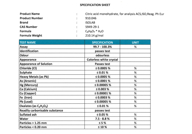 CITRIC ACID ≥ 99.7%, FOR ANALYSIS ACS,ISO,REAG.PH.EUR