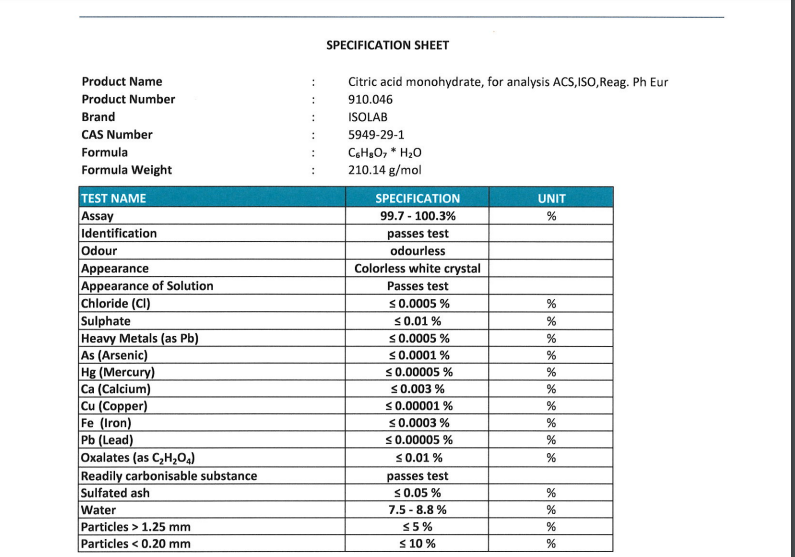 CITRIC ACID ≥ 99.7%, FOR ANALYSIS ACS,ISO,REAG.PH.EUR