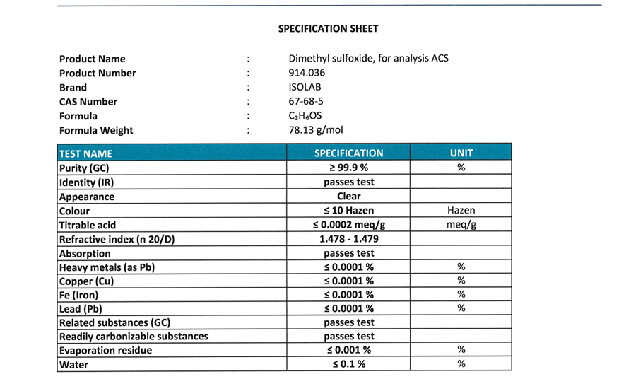 Dımethyl Sulfoxıde ≥ 99.9%(Dimetil Sülfoksit), For Analysıs Acs Cas No:67-68-5 2,5LT cam şişe