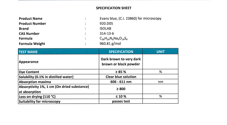 Evans Blue, (C.I. 23860) For Mıcroscopy Cas No:314-13-6 50G plastik şişe