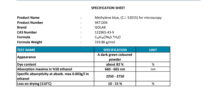 Methylene Blue, (C.I. 52015) For Mıcroscopy Cas No:122965-43-9 50G plastik şişe