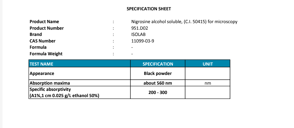 Nıgrosıne Alcohol Soluble, (C.I. 50415) For Mıcroscopy Cas No:11099-03-9 50G plastik şişe