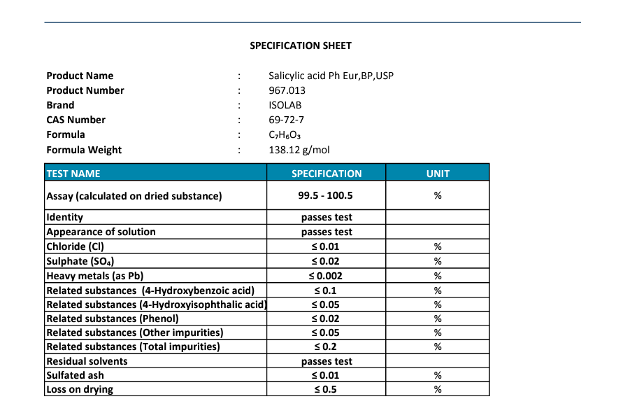 Salıcylıc Acıd ≥ 99.5%, Ph.Eur, Bp, Usp Cas No:69-72-7 1KG plastik şişe