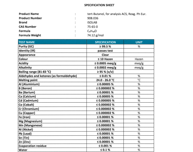 Tert-Butanol ≥ 99.5%, For Analysıs Acs, Reag. Ph Eur. Cas No:75-65-0 1ML cam şişe