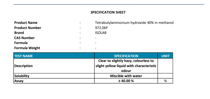 Tetrabutylammonıum Hydroxıde ( Tetrabütilamonyum Hidroksit) %40(Metoh) Cas No:- 100ml plastik şişe